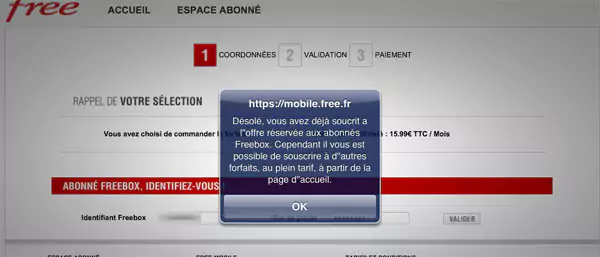 Dorénavant, Free indique, au travers d’un message dans une pop up, que le compte Freebox a déjà bénéficié de l’abonnement à tarif réduit.