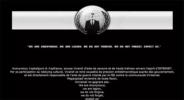 En représailles au blocage de Megaupload, des Anonymous s’en sont pris ce soir au site de Vivendi. Le site affiche désormais le message suivant : « Anonymous #opbelgium & #opfrance, accuse Vivendi d’acte de censure et de haute trahison envers l’esprit d’INTERNET. Par sa participation au lobbying culturel, Vivendi se rend coupable de pression antidémocratique auprès des gouvernements, et est directement responsable de l’acte de guerre intenté par le FBI contre la communauté d’internet. Megaupload reviendra de toute façon, Universal ne gagnera pas".