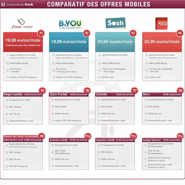 Le Journal du Geek a réalisé un comparatif des offres mobile dans la gamme de prix qui est celle du forfait illimité de Free Mobile. En fonction de différents critères (services proposés, tarifs, mentions écrites en minuscule dans les CGV), nos confrères ont ainsi réalisé un classement des différentes offres du marché. Et même si le marché a réagi à l’arrivée de Free Mobile en baissant les tarifs, c’est ce dernier qui prend la tête de ce classement.