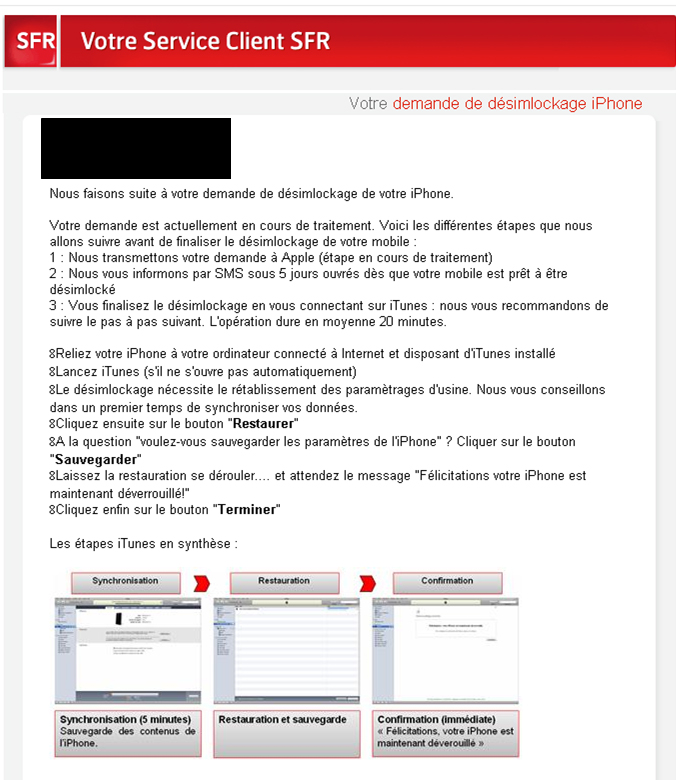 Depuis plusieurs jours maintenant, les témoignages se multiplient concernant le peu d’entrain que met SFR pour traiter les demandes de desimlockage. Selon les personnes concernées, celui-ci interviendrait plusieurs semaines après que la demande ait été faite. Un témoignage parmi d’autres :