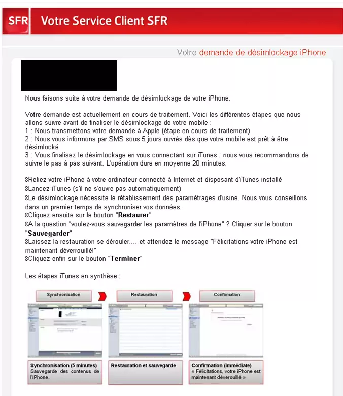 22/01 : réception du mail confirmant la demande de desimlockage alors que j’ai déjà reçu ce même jour ma sim Free mobile et plus de ligne SFR
