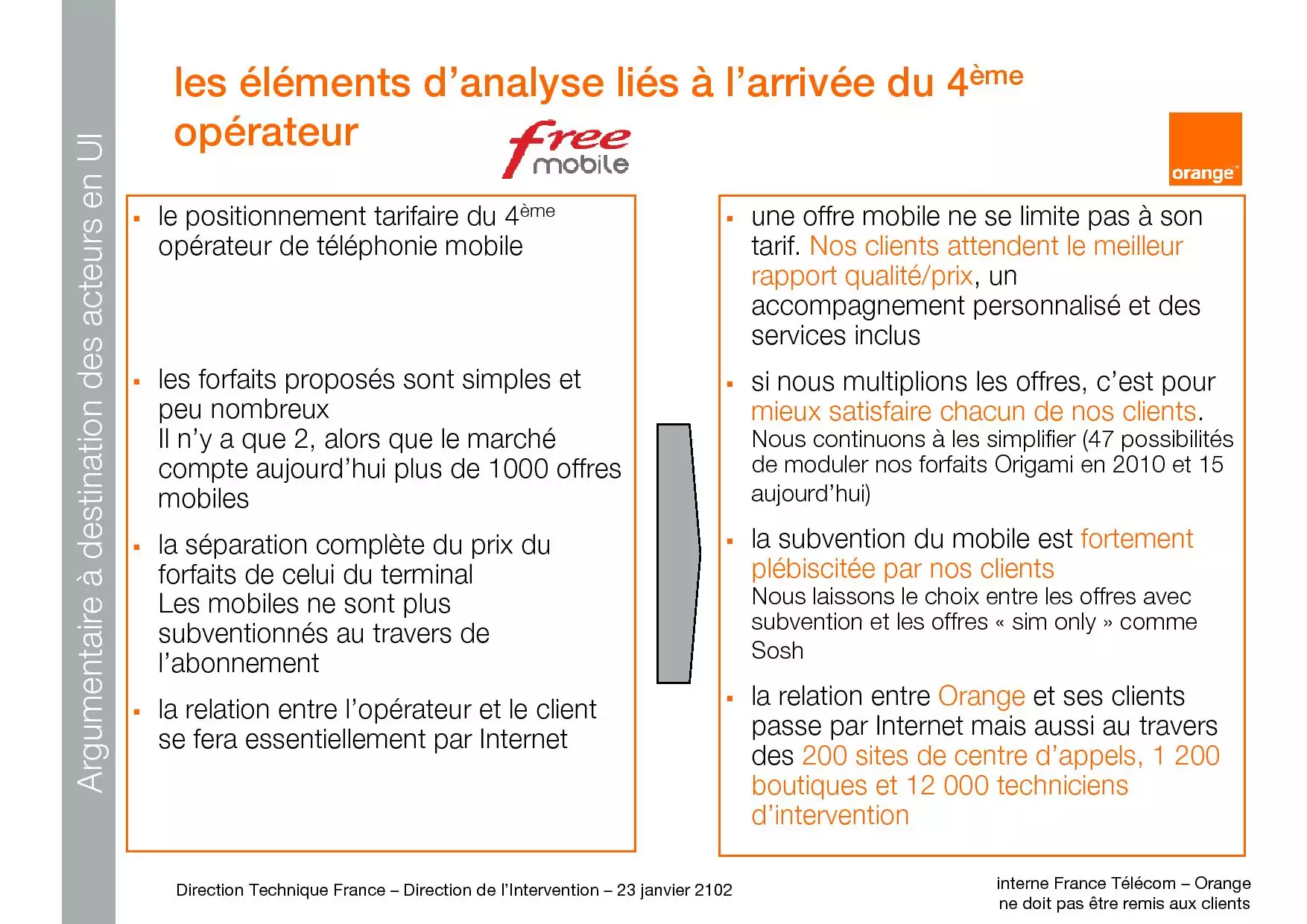 PcInpact s’est procuré un argumentaire interne destiné aux salariés d’Orange visant à démontrer les avantages de l’offre mobile d’Orange par rapport à Free Mobile. Intitulé « Nos clients vous interrogent sur les offres mobiles, comment leur répondre ? », le texte produit par la direction Technique France d’Orange à l’intention des Unités d’intervention propose un argumentaire qui va dans le sens des propos de Stéphane Richard. Evidement, ce document n’est pas destiné à la clientèle.