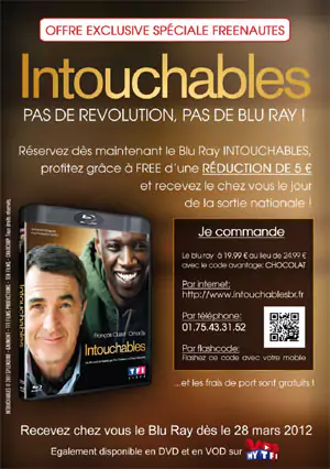 MyTF1 propose une offre exclusivement réservée aux Freenautes. Le service de TF1 permet de réserver le Blu ray du film Intouchables dès maintenant pour le recevoir le jour de la sortie nationale, le 28 mars prochain. Une réduction de 5 euros sera également appliquée, le blu ray sera donc facturé 19,99 euros au lieu de 24,99 euros. Les frais de port sont, eux, gratuits.