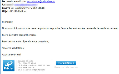 S’il s’agissait d’une erreur, Prixtel devrait donc rembourser ces appels vers le 3179 lorsque l’abonné en fait la demande, mais ce n’est même pas le cas. Bertrand, qui nous remonté le problème, a en effet demandé le remboursement de ces appels. Mais l’opérateur lui envoie en retour un refus.