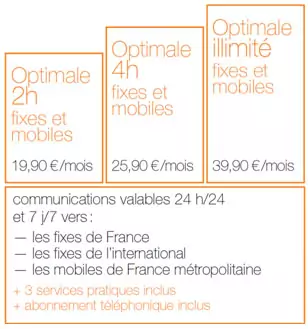 Chaque forfait Optimale fixes et mobiles inclut l’abonnement à la ligne fixe Orange et 3 services (transfert d’appel, présentation du nom et signal d’appel
