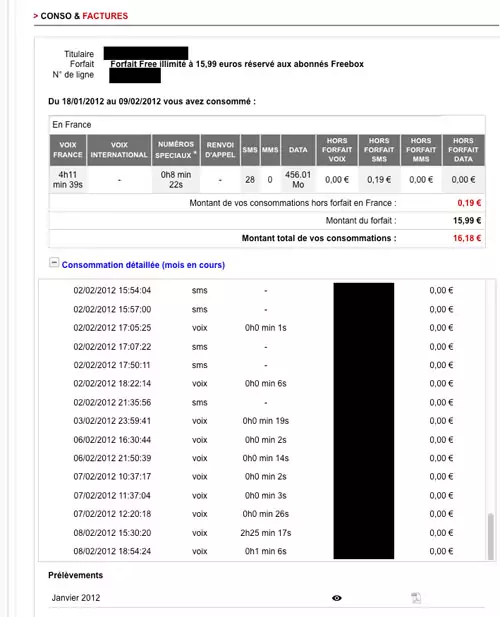 Free Mobile a ajouté ce matin la facturation detaillée des appels voix et SMS Free Mobile. Vous pouvez la découvrir sur votre espace abonné, dans la rubrique Conso et Factures. On notera aussi que Free a clarifié les chose en remplaçant l’intitulé "Voix hors forfait", qui était peu parlant par "Voix International"