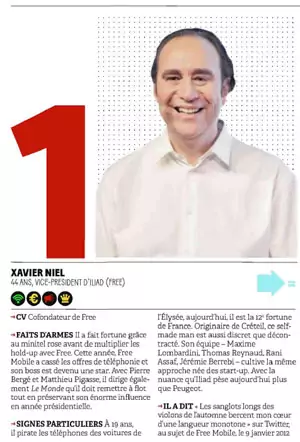 A la tête de du classement des 30 hommes les plus influent on retrouve Xavier Niel, pour la deuxième année consécutive. C’est le rachat du Monde en 2010 et le lancement de Free Mobile qui permet au fondateur de Free de conserver cette première place. Xavier Niel est suivi dans ce classement par Maurice Lévy, le Président de Publicis, et Rodolphe Belmer le Directeur Général de Canal+