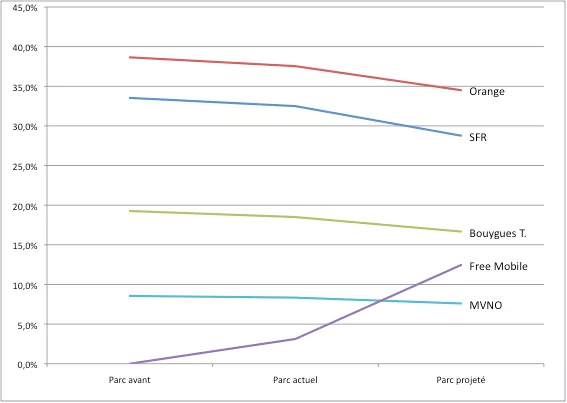 Les MVNO perdraient également un peu de terrain, le principal risque pour eux étant néanmoins de perdre leurs chances de croissance, en voyant Free Mobile les supplanter dans la conquête des « déçus » des opérateurs historiques.