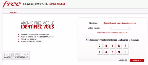 Free vient de faire évoluer l’authentification à son espace abonné. Il n’est désormais plus possible de faire un copier/coller de l’identifiant, puisque celui-ci doit être tapé avec des touches numériques virtuelles. Celles-ci sont par ailleurs dans le désordre ce qui ne facilite pas la tâche.