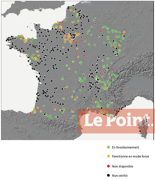 1/ Il apparaît tout d’abord que le nombre d’antennes déclarées prêtes à émettre s’est stabilisé à partir d’octobre 2011 (955 sites en octobre, 979 en février). Ce nombre diffère de celui communiqué récemment à l’ARCEP qui serait de 735 stations en « service opérationnel », plus faible de 25 %. Parmi les stations contrôlées, 423 d’entre elles (92 %) ont été constatées en émission. En supposant que les taux restent stables pour les stations restant à inspecter, le total des relais en émission devrait approcher le total de 900.