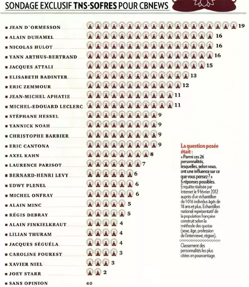 L’enquête montre en effet que seuls 3% des français estiment que Xavier Niel a de l’influence. La question posée, à un échantillon représentatif de 1016 individus âgés de 18 ans et plus, était « Parmi ces 26 personnalités, lesquelles, selon vous, ont une influence sur ce que vous pensez ? ». Le fondateur de Free, qui a été très médiatisé depuis le début de l’année, se classe en avant dernière position, juste devant Joey Starr.
