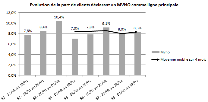 En ce qui concerne les MVNO, churntracker@mobile estime que l’arrivée de FREE MOBILE ne semble pas avoir affecté globalement ces acteurs du marché puisque la part de marché clients mesurée est identique entre les mois de février et de mars 2012 à 8,3 % même si l’on peut observer des variations d’une semaine sur l’autre ou d’un opérateur à l’autre. Ce nombre d’abonnés avait cependant significativement chuté en janvier lors du lancement de Free Mobile.