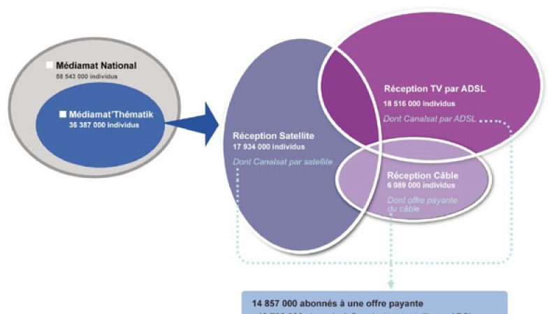 Médiamétrie vient de publier son Mediamat’Thématik pour la période 29 août 2011 au 12 février 2012, qui mesure l’audience de tous les foyers bénéficiant d’une offre de télévision élargie, c’est-à-dire comportant plus de chaînes que sur la TNT. Outre les audiences, cette étude présente également l’ensemble des téléspectateurs disposant d’une offre élargie, qu’ils passent par le satellite, l’ADSL ou le câble. Si la télévision par ADSL avait déjà dépassé le satellite « payant » et le câble, cette nouvelle étude montre que maintenant, elle dépasse également le satellite « payant + gratuit », avec 18 516 000 individus qui y ont accès. En moins de 10 ans, cette technologie lancée pour la première fois en France par Free est donc devenue la plus utilisée en France pour accéder à une offre de télévision élargie, dépassant ainsi le câble et le satellite, installés pourtant depuis plus longtemps.