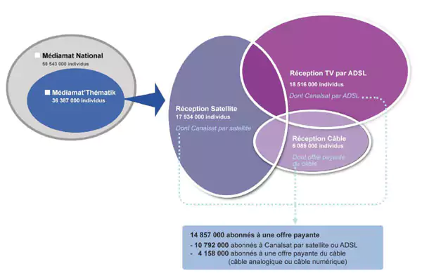 Médiamétrie vient de publier son Mediamat’Thématik pour la période 29 août 2011 au 12 février 2012, qui mesure l’audience de tous les foyers bénéficiant d’une offre de télévision élargie, c’est-à-dire comportant plus de chaînes que sur la TNT. Outre les audiences, cette étude présente également l’ensemble des téléspectateurs disposant d’une offre élargie, qu’ils passent par le satellite, l’ADSL ou le câble. Si la télévision par ADSL avait déjà dépassé le satellite « payant » et le câble, cette nouvelle étude montre que maintenant, elle dépasse également le satellite « payant + gratuit », avec 18 516 000 individus qui y ont accès. En moins de 10 ans, cette technologie lancée pour la première fois en France par Free est donc devenue la plus utilisée en France pour accéder à une offre de télévision élargie, dépassant ainsi le câble et le satellite, installés pourtant depuis plus longtemps.