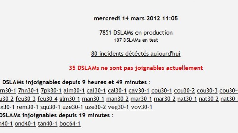 Le réseau Free rencontre actuellement des difficultés dans les Sud de la France. Ainsi que l’indique free-reseau.fr, ce ne sont pas moins de 31 DSLAM qui sont impactés dans les départements du Gard. Le département des Landes est également touché. Depuis près de 10h maintenant, les Freenautes reliés à ces DSLAM n’ont plus de connexion. Il n’y a pour le moment pas d’information quant à la cause du problème ni quant au délai de retour à la normale.