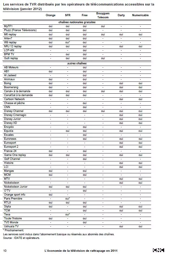 Free propose l’offre de télévision de rattrapage la plus large de tous les services de télévision inclus dans les abonnements des opérateurs de télécommunication. Disponible depuis la fin du mois de juin 2010, le service Freebox replay permet aux abonnés de l’opérateur de voir ou revoir les programmes de près de 40 chaînes, sans compter les services du groupe Canal+ (Canal+ à la demande et CanalSat à la demande). Trois services sont disponibles auprès de tous les opérateurs : M6 replay, Canal+ à la demande et Disney Channel. Canal+ à la demande est disponible sur la Bbox de Bouygues Telecom depuis avril 2011. Déjà disponible sur CanalSat à la demande et Numericable, l’offre de TVR de Disney Channel est proposée auprès de l’ensemble des opérateurs suite au passage de la chaîne dans les bouquets de base de Orange, SFR, Free et Bouygues en avril 2011