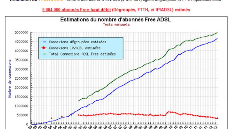 Selon le site Francois04, Free a franchi cette semaine la barre symbolique des 5 millions d’abonnés à ses offres ADSL. Même si ce ne sont pas des chiffres officiels, cette estimation est en ligne avec le nombre d’abonnés annonce par Iliad au 31 décembre 2011. A cette date Alice + Free comptabilisaient 4 849 000 abonnés. Le groupe aurait donc recruté 150 000 abonnés en un peu plus de 3 mois.