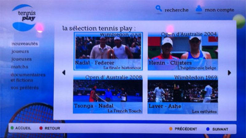 Canal 140 – Tennis Play : Cette chaîne en Vidéo à la Demande par abonnement propose de revivre les plus grands matchs de tennis. Les programmes seront également accessibles en vidéo à la demande par abonnement (8,99 euros par mois) et à l’acte (1,99 euros pour un documentaire de 26 minutes, 2,99 euros pour un 52 minutes et 3,99 euros pour un match dans son intégralité).