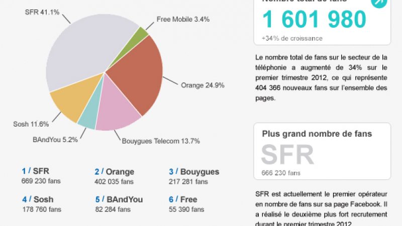 En effet, le nombre total de fans sur le sujet de la téléphonie mobile a augmenté de 34% au premier trimestre ce qui représente 404 366 nouveaux fans sur Facebook. Si SFR connait quelques difficultés en termes de recrutement, l’opérateur compte tout de même le plus grand nombre d’abonnés à son compte Facebook. Quant à Orange, c’est l’opérateur qui a le plus fortement recruté sur la période. Et BandYou est l’opérateur qui connaît la plus forte accélération de son recrutement d’amis virtuels. Pour finir, Free totalise tout de même 34 300 fans sur son compte ouvert depuis début 2012.