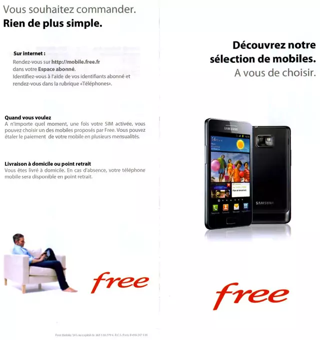 Alors que Free Mobile envoyait jusqu’à présent une simple feuille, regroupement les informations de l’abonné, avec ses cartes SIM, l’opérateur y joint maintenant une brochure qui présente les téléphones qu’il propose à la vente. Il ne s’agit cependant que d’un document informatif, il faudra dans tous les cas passer par Internet pour pouvoir commander un des téléphones proposés.