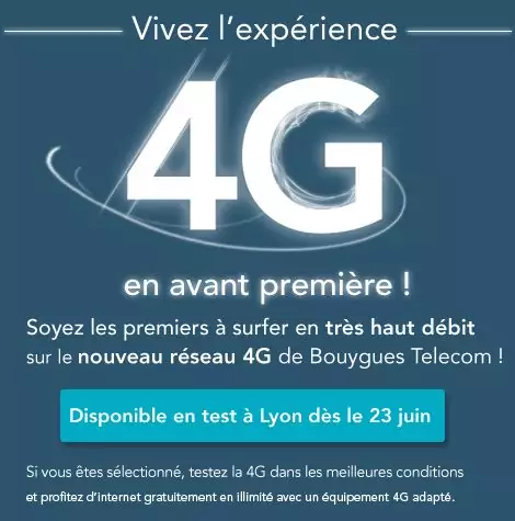 Les abonnés Bouygues Télécom habitant à Lyon peuvent se tourner vers leur opérateur pour tester le réseau 4G. Pour se faire, il suffit de s’inscrire sur le site dédié à cette nouvelle fréquence afin d’être sélectionné. Le test se fera dès le 23 juin pour les particuliers disposant d’une offre Forfait (voix), Offre Internet Mobile ou Bbox avant la date de début de la sélection. 100 clients seront sélectionnés.