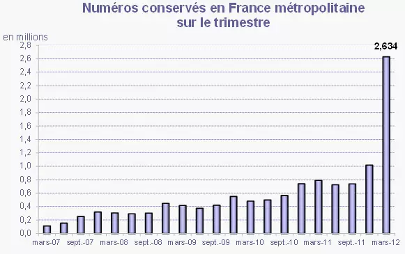Dans son observatoire du marché mobile du 1er trimestre, l’ARCEP rapporte une donnée très marquante : le nombre de portabilités effectuées sur trois mois. L’ARCEP note que « La conservation du numéro a fait un bond spectaculaire au premier trimestre 2012, avec 2,6 millions de numéros portés contre un million au cours du quatrième trimestre 2011. » Sur les 3 premiers mois de l’année, ce sont ainsi 2,634 millions d’abonnés mobiles qui ont changé d’opérateur, alors que ce chiffre n’était que d’environ 1 million le trimestre précédent. Tous ces abonnés ne sont évidemment pas allés chez Free Mobile, mais cela permet en tous cas de donner une indication sur le bouleversement qu’a engendré l’arrivée du nouvel opérateur.