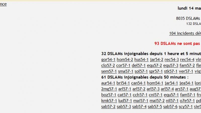 Selon free-reseau.fr et vos témoignages, un certain nombre de DSLAM en Lorraine sont victimes d’une panne impliquant la perte des services Internet, Téléphone et Télévision depuis plus d’une heure pour les abonnés raccordés aux DSLAM suivants :