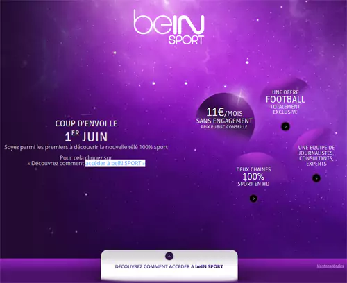 En attendant le lancement des chaînes sportives qui dispose notamment des droits de retransmission des rencontres de l’Euro-2012 et 2016 de football, tout comme M6 et TF1 le groupe qatari a ouvert un site d’informations permettant au public de s’inscrire pour recevoir en avant-première les renseignements concernant les modalités pour accéder aux programmes sportifs.