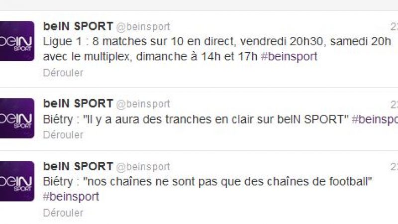 Hier, Beinsport présentait les contour de sa chaîne. En direct sur Twitter, Nasser al-Khelaïfi président d’Al-Jazira Sport et de QSI, l’actionnaire majoritaire du Paris Saint-Germain et Charles Biétry ont présenté la grille des programmes et ont également indiqué que les deux chaînes seront bien disponible sur Freebox TV et sur les autres box ADSL. Beinsport sera donc accessible pour 11€ par mois sans engagements et proposera aussi des tranches en clair (6 heures-9 heures, 12 h 30-13 h 30,19 heures-20 h 30).