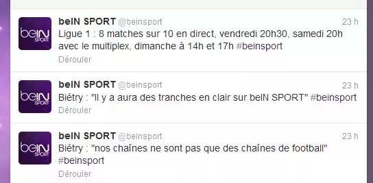 Hier, Beinsport présentait les contour de sa chaîne. En direct sur Twitter, Nasser al-Khelaïfi président d’Al-Jazira Sport et de QSI, l’actionnaire majoritaire du Paris Saint-Germain et Charles Biétry ont présenté la grille des programmes et ont également indiqué que les deux chaînes seront bien disponible sur Freebox TV et sur les autres box ADSL. Beinsport sera donc accessible pour 11€ par mois sans engagements et proposera aussi des tranches en clair (6 heures-9 heures, 12 h 30-13 h 30,19 heures-20 h 30).