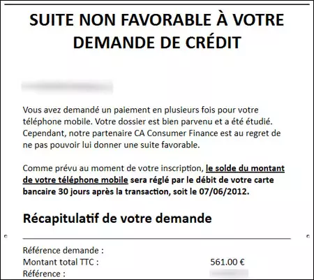 Les choses se compliquent pour un crédit supérieur à 200 euros puisque il faut renvoyer des documents et si le crédit est refusé, l’abonné pourra être prélevé en une seule fois, sur sa carte de crédit, du prix du téléphone. Une situation qui engendre évidemment des problèmes pour les abonnés concernés.