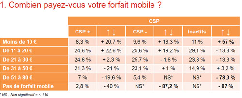 Tous les groupes socio-professionnels ont largement profité ce trimestre des forfaits à moins de 20 € par mois, et en particulier les inactifs, qui sont 57 % de plus qu’au trimestre dernier à avoir choisi un forfait mensuel à moins de 10 €. L’impact de ces nouveaux tarifs conduit à une baisse du nombre d’internautes ne possédant pas de forfait mobile, puisque seulement 6 % de l’ensemble des individus déclarent ne pas avoir de forfait mobile, contre 6,8 % au trimestre précédent, soit une diminution de près de 10 %. Il faut noter que chez les CSP – et les inactifs, cette diminution atteint le chiffre de 87 %.