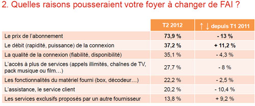 Les internautes français restent très sensibles au prix de l’abonnement, toujours cité comme la première raison poussant à changer de FAI. Le prix perd néanmoins 13 % entre le 1er et le 2e trimestre 2012. Dans le même temps, le débit de la connexion gagne plus de 11 %. Alors que les offres actuelles ont tendance à se valoir en termes de prix et de services, les internautes se laisseraient-ils séduire par les nouvelles offres très haut débit (malgré un prix plus élevé) et les usages qu’elles permettent : radio, multitâche, téléchargement rapide ?