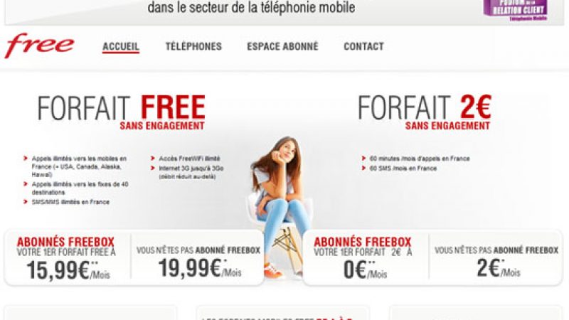 Free vient de lancer une nouvelle version de la page d’accueil du site de Free Mobile. Si on retrouve les mêmes informations, l’aspect graphique et la disposition ont été modifiés. Free a également ajouté un bandeau annonçant qu’il avait obtenu le 1er prix du podium de la relation client dans le secteur de la téléphonie mobile.