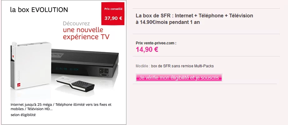 A l’instar de Free, SFR propose sa box sur vente privée. La Neufbox Evolution s’affiche à 14,90€ par mois contre 1,99€ par mois pour la Freebox V5. La dernière box de SFR est aussi proposée à 9,90€ sous condition de disposer d’une offre mobile (remise Multi-Packs).