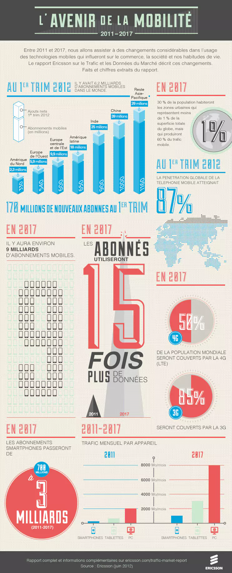 Ericsson vient de diffuser une étude sur l’avenir de la mobilité à partir d’un large échantillon de réseaux couvrant les diverses régions du monde. Ce rapport a pour vocation d’être un document d’analyse, basée sur ces constatations et mesures, mais aussi sur des prévisions internes et d’autres études applicables, afin de mieux appréhender la réalité du trafic actuel et de mieux cerner les tendances du marché. Il est ici résumé en une seule infographie.