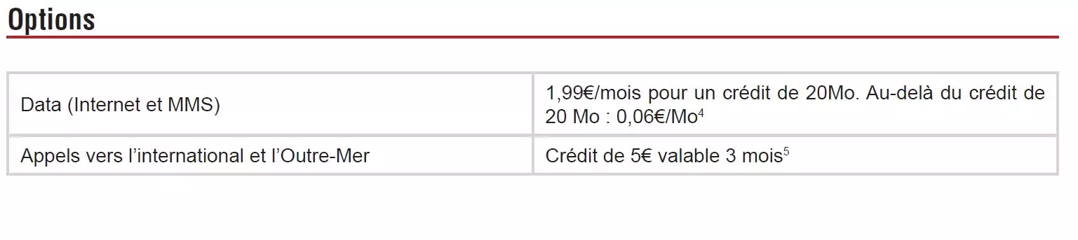 Crédit valable 3 mois à compter de son activation. Appels voix fixes et mobile depuis la France Métropolitaine vers l’international et l’Outre-Mer, décomptés selon les tarifs disponibles dans la grille tarifaire applicable au Forfait 2€. Crédit rechargeable depuis l’espace abonné. En cas de recharge avant la fin de validité du crédit, le montant rechargé s’ajoute au solde éventuel de crédit. La durée de validité de la recharge s’applique à la totalité du crédit d’appels (solde inclus).