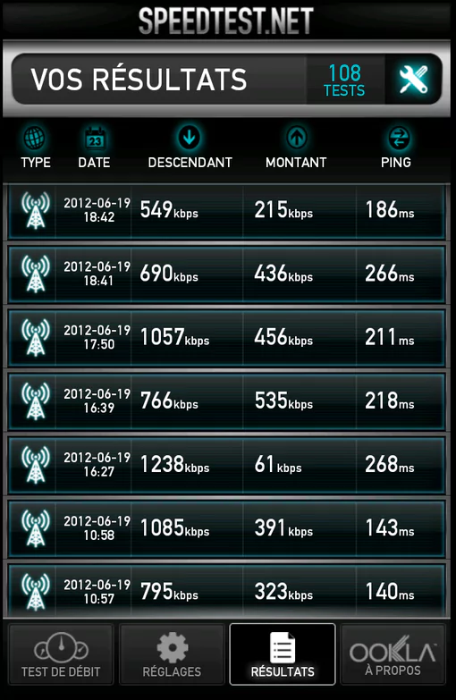 D’après de nombreuses mesures effectuées dans toute la ville sur des antennes Free et Orange, entre 8h et 00h, il est désormais difficile de dépasser la barre des 1 200 kpbs tandis que le débit moyen se situe autour de 1000 kpbs. Pour s’assurer qu’il ne s’agissait pas d’un problème isolé, nous avons utilisé plusieurs smartphones différents (Nokia 900, Galaxy S III, iPhone 4S), ainsi que plusieurs lignes Free. Le constat est toujours le même : les débits sont très bas. La nuit, la situation s’améliore avec des débits situés autour de 2000 kpbs, voir plus.