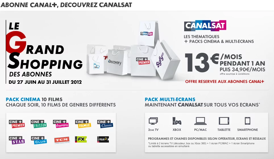 En cette période de soldes, les chaînes griffées Canal + sont disponibles à 23€ par mois pendant un an puis 39, 90€/ mois. Il s’agit d’une promotion valable du 27 juin au 31 juillet 2012 proposant un rabais de 40% sur les chaînes canal + ou pour un abonnement CanalSat.