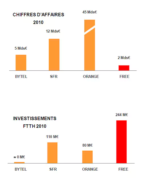 FAI à ne pas investir dans la fibre, ou si peu, se contentant de jouer les coucous (un terme qu’il aime à utiliser en parlant de Free et de MVNO) sur le réseau de Numéricâble. En termes d’investissements réseau, Bouygues Télécom n’a certainement de leçon à donner à personne. D’autant plus que Free est l’opérateur qui investit le plus, tous réseaux confondus, par rapport à son chiffre d’affaires (plus de la moitié de son CA a été consacré aux investissements en 2011)
