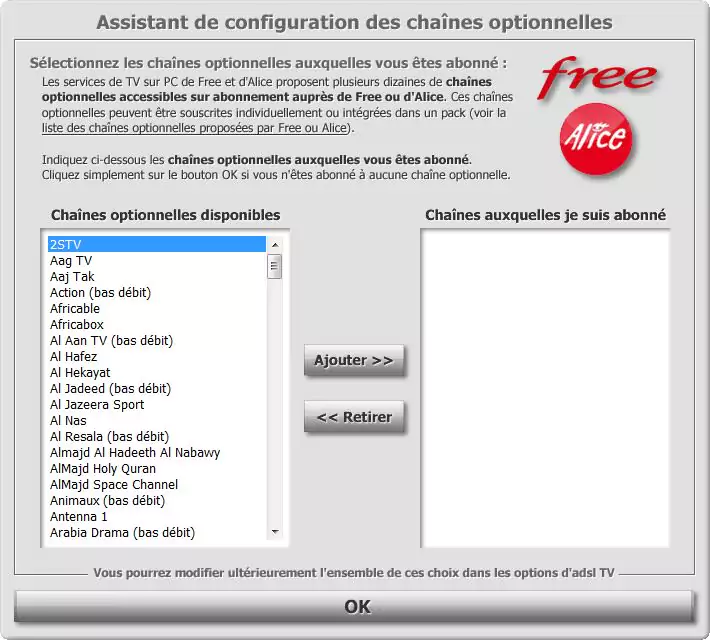 Cette nouvelle version intègre un assistant de gestion des chaînes optionnelles Free et Alice permettant de sélectionner lors de la première installation les chaînes optionnelles auxquelles on est abonné.
