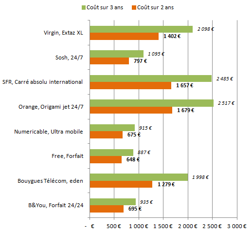 Quoi qu’il en soit, le consommateur doit regarder la chose de près. Le site lesnumeriques.com a récemment opéré un travail comparatif sur les différences de prix notamment sur le Samsung Galaxy Ace. Selon une offre de huit opérateurs, dont quatre qui séparent bien l’achat du téléphone et le prix du forfait, les offres de Free et Numericable, les moins chers, ont coûté 1.000 euros de moins que celle d’Orange et de SFR après 24 mois.