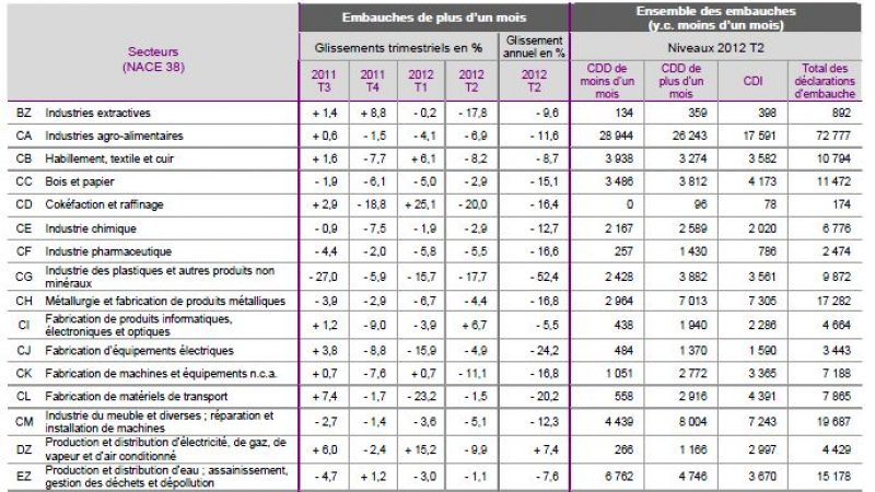 Et le secteur des télécoms est le plus touché. Ainsi, entre le 2e trimestre 2011 et le 2e trimestre 2012, les déclarations d’embauche dans les télécoms reculent de 33,7%.