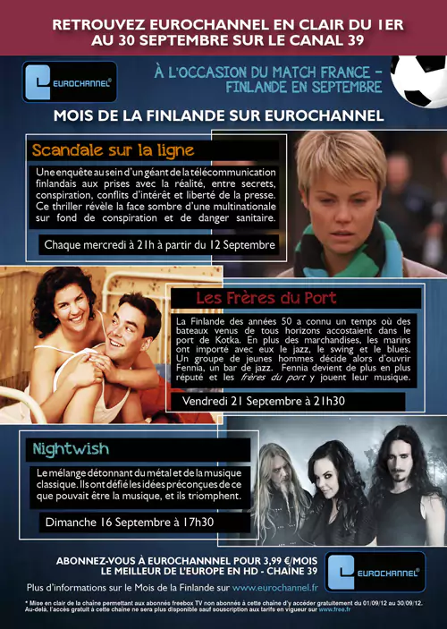Eurochannel, la première chaîne de télévision entièrement dédiée à la production artistique européenne, vient d’annoncer à Univers Freebox la mise en clair de la chaîne maintenant (disponible sur le canal 39 de Freebox TV) du 1er au 30 Septembre à l’occasion du Mois de la Finlande. Vous pouvez d’ores et déjà consulter la programmation spéciale Mois de la Finlande et les horaires sur cette page.