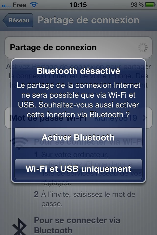 Il suffit d’activer le service, choisir les modalités de connexion (wifi, cable usb ou Bluetooth) ce qui permettra à votre PC de se configurer sur la connexion. A noter qu’en liaison wifi, il faut rechercher le réseau sans fil depuis votre ordinateur. Votre iPhone affichera "partage de connexion en cours".