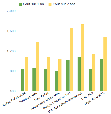 Dans le cas d’un changement de terminal chaque année, la formule d’Orange est plus avantageuse car contrairement à SFR et Bouygues, Orange propose le même prix d’achat de mobile et de forfait, que l’on souscrive sur 1 ou 2 ans. La première année, les tarifs de 6 offres sur 8 sont très serrés, ils sont proches : de 830 €, de 803 € chez Numericable à 864 € chez Bouygues et son format Eden, pourtant à 74,90 € par mois. Sur un an, l’offre Orange est donc la 2ème moins chère, à 829 €, juste devant Free (835 €) et B&You (837 €).