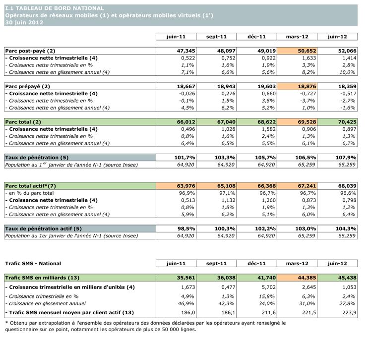Les opérateurs de réseaux gagnent 695 000 clients, soit un total en métropole de 60,1 millions de clients. La part de marché des MVNO augmente légèrement ce trimestre (11,35% au T2 2012 et 11,21% au T1 2012) grâce à une croissance de 191 000 cartes SIM au cours du trimestre. La parc total des MVNO s’élève à 7,7 millions en juin 2012.