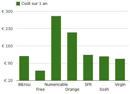 L’offre qui arrive juste après, est celle de Virgin Mobile : 308€ sur 1 an et 430. Les tarifs s’envolent par contre chez Numéricâble où ce même forfait revient à 733€ sur 2 ans et surtout SFR, ou il faudra s’acquitter de 746€, toujours sur 2 ans.