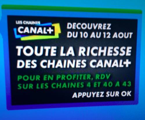 Nous vous rapportions jeudi que les 5 chaînes Canal+ étaient actuellement diffusées en clair sur la Freebox, sans connaitre la durée de cette opération. Nos confrères d’argentdubeurre.com on constaté que cette mise au clair était également en place sur la Bbox. Et sur celle-ci, il est indiqué que l’opération sera disponible jusqu’au dimanche 12 août, et donc, a priori, ce sera également le cas sur la Freebox.