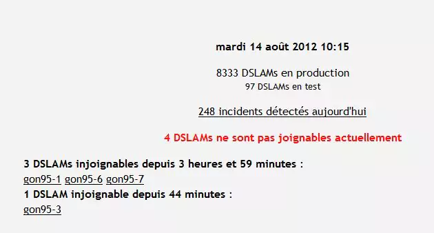 Selon free-reseau.fr et vos témoignages, un certain nombre de DSLAM en région parisienne sont victimes d’une panne impliquant la perte des services Internet, Téléphone et Télévision depuis plus de QUATRE HEURES pour les abonnés raccordés aux DSLAM suivants :